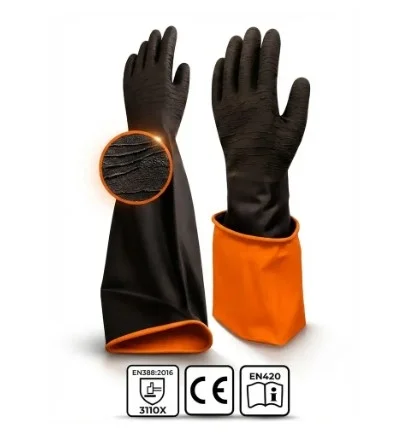 Korun Tırtıklı 60 cm Uzun Siyah İş Eldiveni, ağır ve riskli çalışma koşulları için özel olarak tasarlanmış dayanıklı bir lateks crinkle iş eldiveni modelidir. 60 cm uzunluğa sahip yapısı sayesinde el, bilek ve ön kol bölgesini tamamen koruyarak maksimum güvenlik sağlar. Özellikle sıvı temasının yoğun olduğu ortamlarda ve derin tank, kuyu veya altyapı çalışmalarında ekstra koruma sunar. Yüksek performanslı lateks kaplaması sayesinde uzun ömürlü kullanım sağlar.