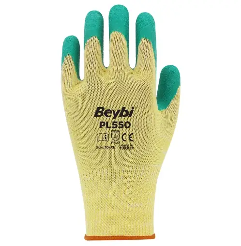 PL550 ÖN YEŞİL KISMI KALIN POLYESTER OLUP ÜST TARAFI SARI % 100 PAMUK ÖRMEDİR. Astarı Polycotton'dur. Parmak hassasiyeti konforlu bir kullanım sunar.Üstün el becerisi ve esneklik için elastik örgü bileklidir.