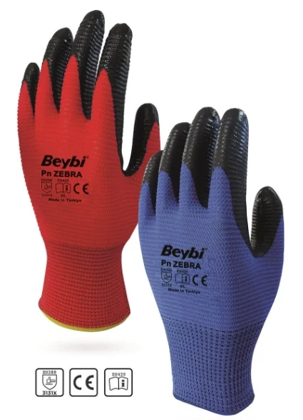 Renk: Kırmızı–Siyah veya Mavi–Siyah kombinasyonu (polyester astar & siyah nitril kaplama).