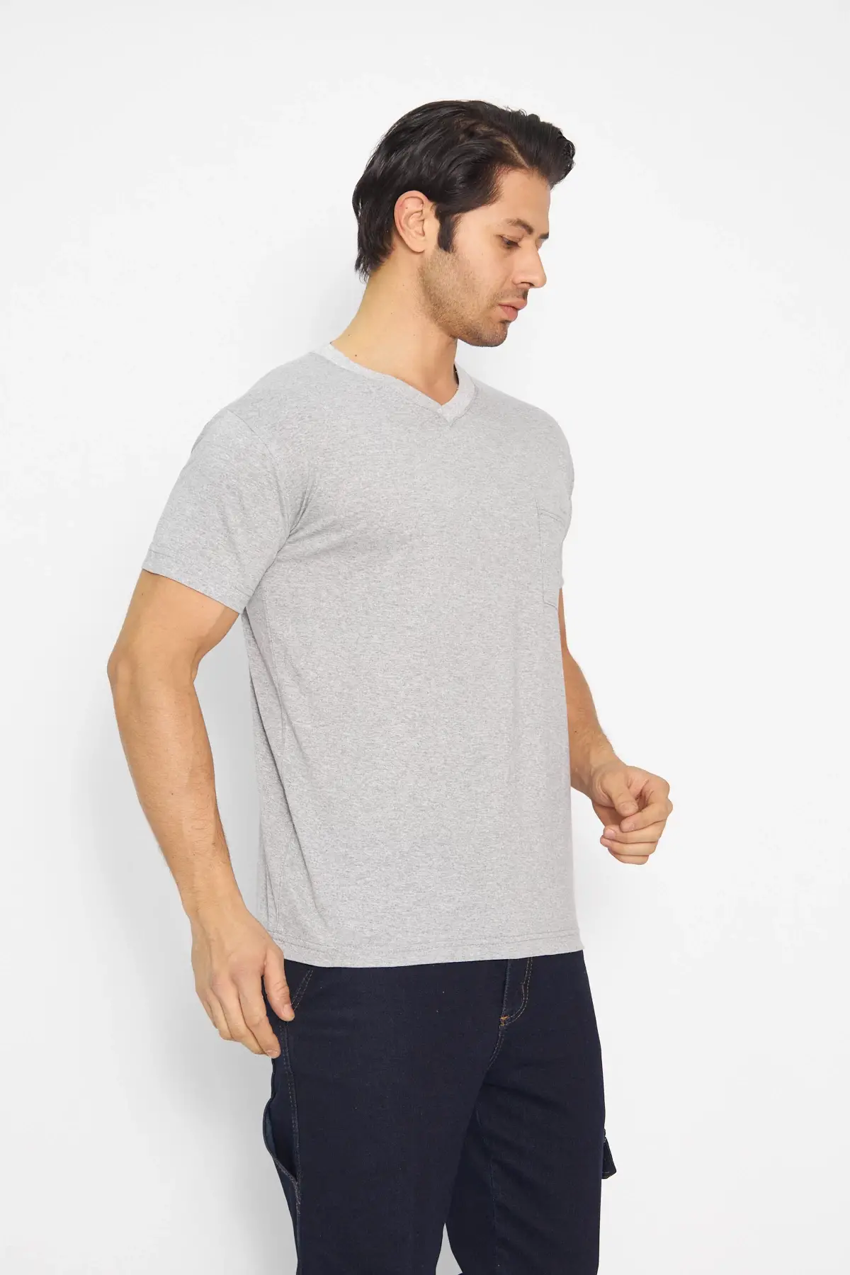 T-shirt V Yaka Kısakol %100 Pamuk Cepli Gri