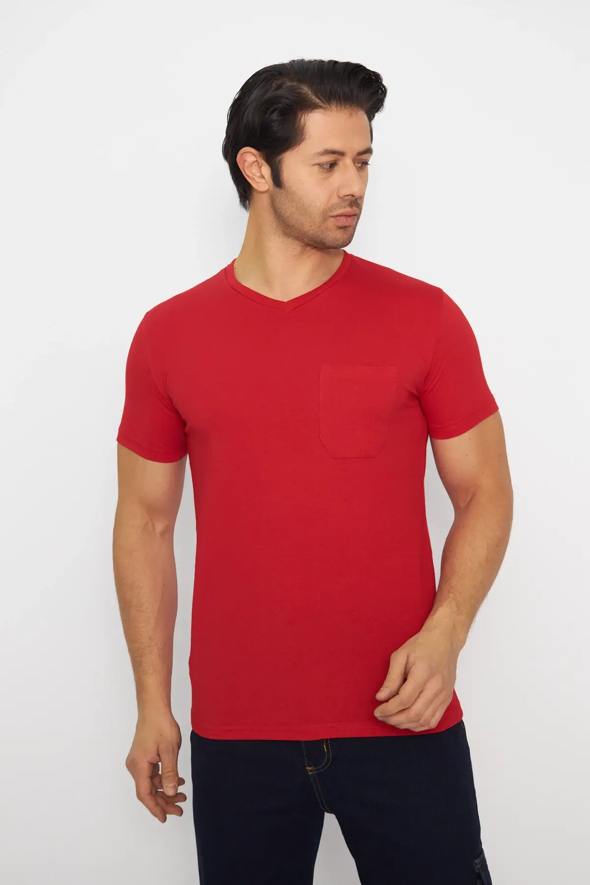 T-shirt V Yaka Kısakol %100 Pamuk Cepli Kırmızı